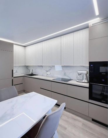 с интегрированными ручками, иактуальной линейной фрезеровкой на мдф фасадах под эмалью